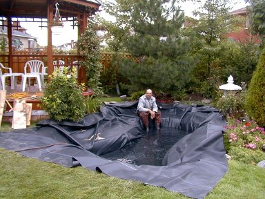 Finally the very tough rubber liner is draped into the hole. It took about four hours to fill the pond with water. As the pond fills, you have to fold the liner so that it fits neatly. Since it was a very cold September day, the 'waders' were a great idea.